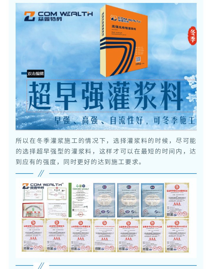 大連志恒眾鑫專業(yè)生產銷售風電灌漿料,強度80Mpa,100Mpa,110Mpa, 120Mpa適用二次灌漿,設備基礎灌漿,我們是大連灌漿料廠家,長春灌漿料廠家,有環(huán)氧砂漿,套筒灌漿料,PC座漿料、自流平砂漿等50多種產品,可滿足您不同需求,有任何技術難題歡迎來電咨詢:400-0411-552 眾鑫特材期待您的光臨!